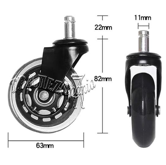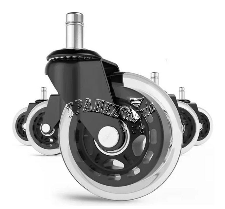 Είναι κατασκευασμένα από υλικό PVC μεταλλικό σκελετό 3 ρουλεμάν σκελετό  για να μη χαράζουν το πάτωμα ακόμη και αν είναι ξύλινο η laminate.Σε συσκευασία 5 τεμαχίων για να αντικαταστήσεις όλες τις ρόδες σου.