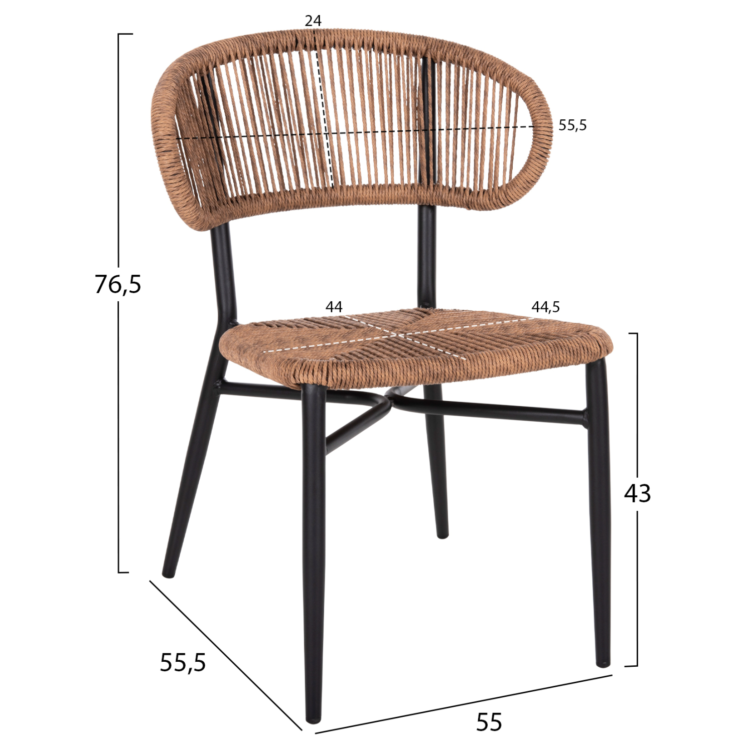 Μοντέρνα καρέκλα εξωτερικού χώρου, κατασκευασμένη από σκελετό αλουμινίου σε φυσική απόχρωση και επενδυμένη με σχοινί wicker rattan πλεκτό σε φυσική απόχρωση.