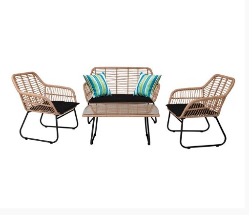 Μοντέρνα πολυθρόνα και καναπές εξωτερικού χώρου, κατασκευασμένα από μεταλλικό σκελετό και επενδυμένα με πλεκτό rattan wicker.