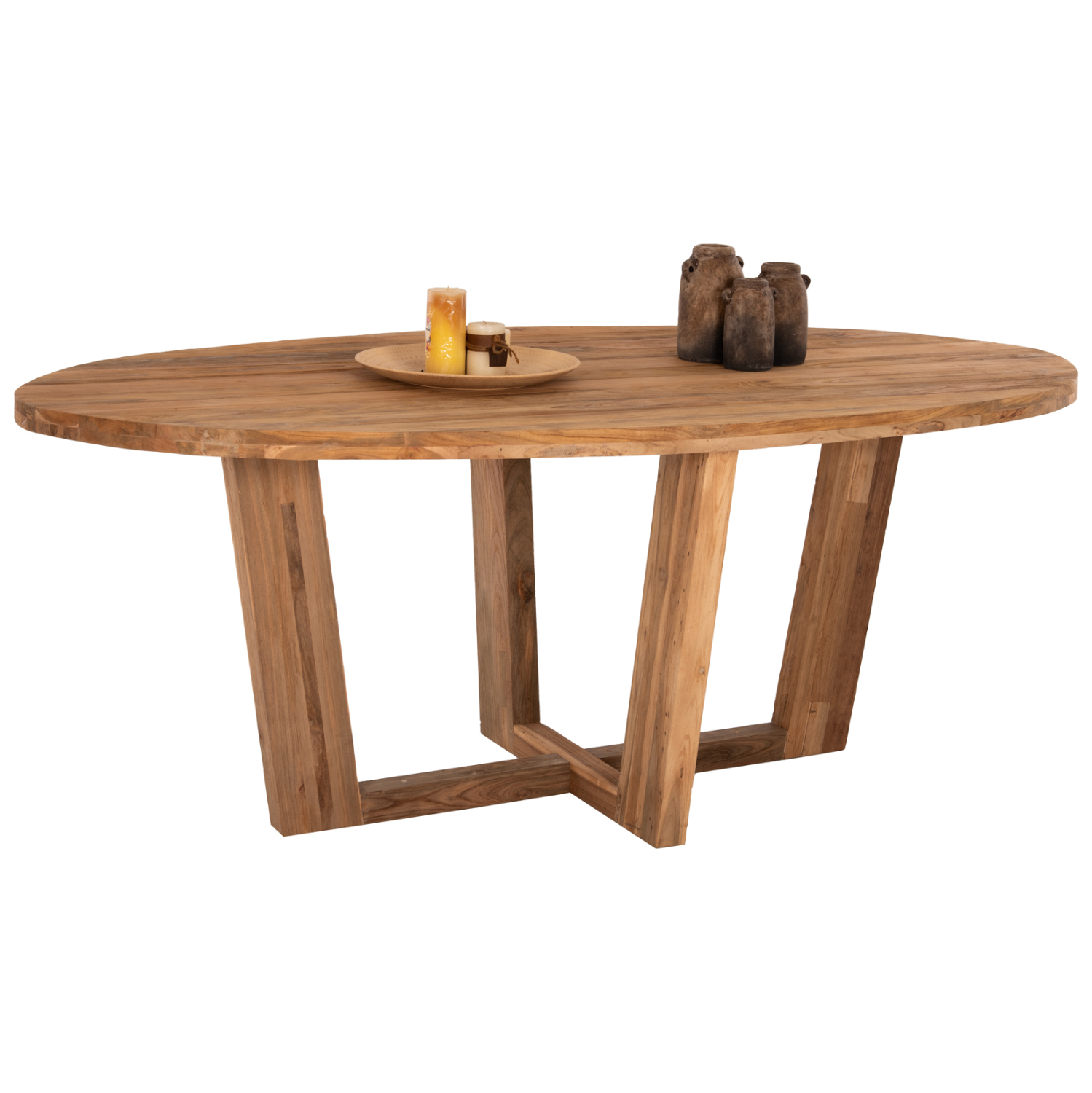 Αυτό το τραπέζι τραπεζαρίας είναι σχεδιασμένο για να φιλοξενήσει πολλά αγαπημένα άτομα προσφέροντας άνεση και στιλ σε μεγάλες συγκεντρώσεις και οικογενειακές συναντήσεις. Είναι κατασκευασμένο από μασίφ ξύλο teak, το οποίο είναι γνωστό για την υψηλή ανθεκτικότητα και την όμορφη φυσική του εμφάνιση.